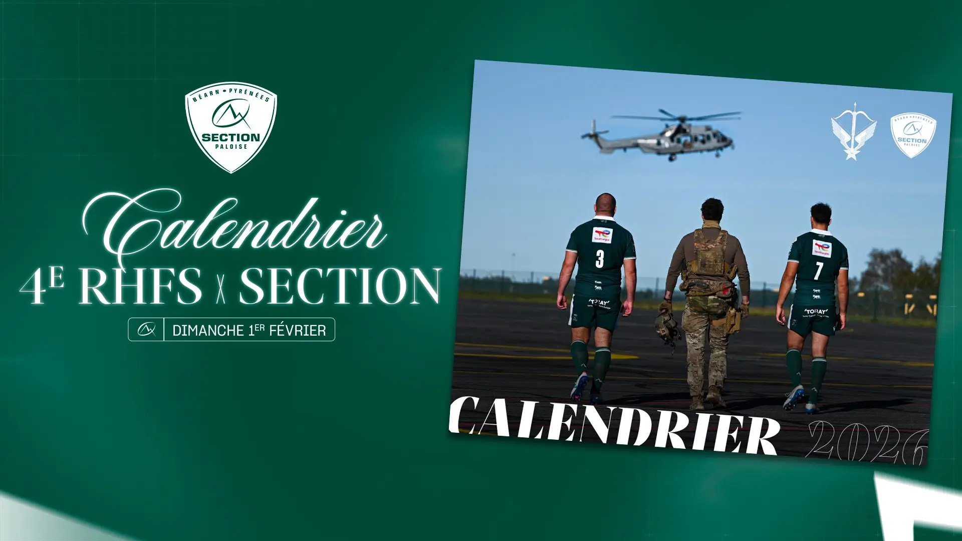 Pour la première fois, le 4e Régiments d’Hélicoptères des Forces Spéciales et la Section s’associent pour vous proposer un calendrier en collaboration. À travers des thématiques communes aux deux entités, les militaires de cette unité d’élite et les joueurs de rugby mettent en image leurs activités.